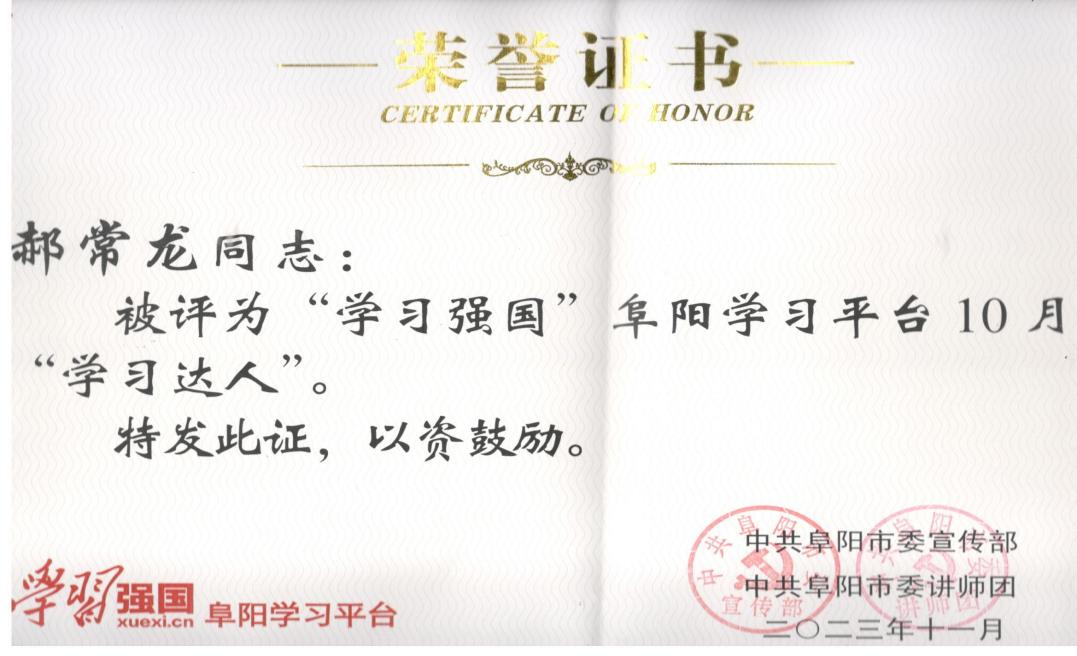 通过建立健全学习考勤、学习积分、学习考核等制度,将学习情况纳入党员考核评价体系,定期对党员的学习情况进行检查督促,确保学习任务的落实和学习效果的达成。党员郝常龙在2023年被阜阳市宣传部评为“学习强国”阜阳学习平台10月份“学习达人”。“每天利用间歇时间通过‘学习强国’平台进行学习,不仅帮助我获取了更多的知识和信息,也促进了我的学习和成长。” 郝常龙说。