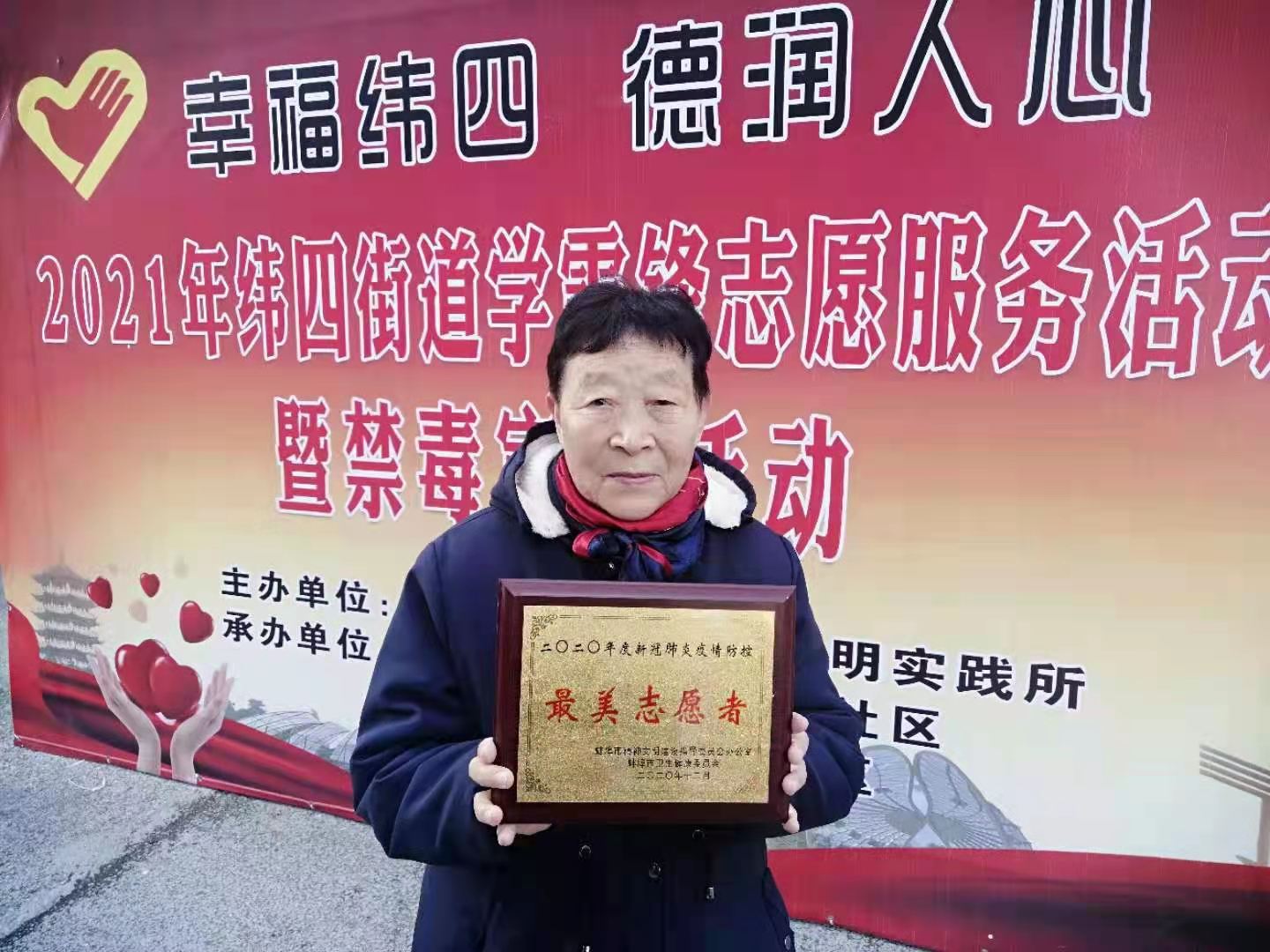 在2020年新冠肺炎抗疫防控的时间里,孙守珍不考虑自己年事己高,疫情的危险,积极参加社区防疫值班,自费购买用品为防控工作服务。抗洪防汛期间组织姐妹们走上堤坝,为一个个值班点送去充电灯,防蚊用品和食品。