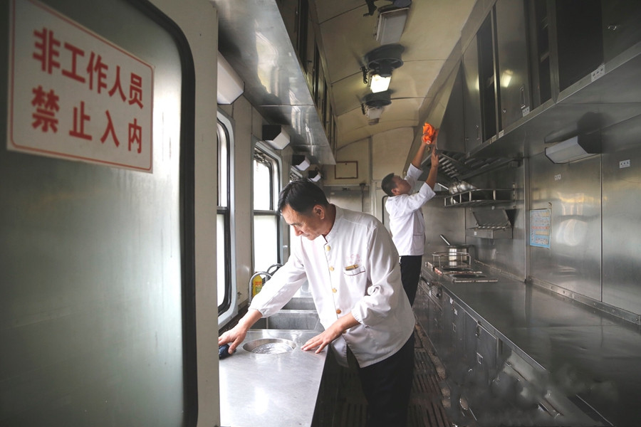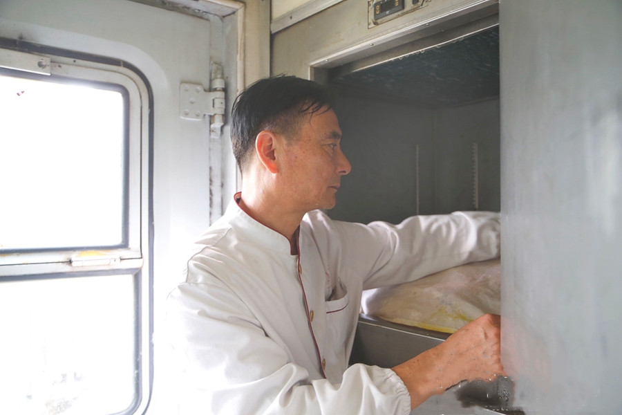 接近正午,3个人要在没有空调、没有风扇的车厢里来回穿梭,此时车厢外平均温度早已达到在35℃,车厢内温度更是超过40℃。“往往还没巡视完一节车厢,还没晾透的衣服便又湿了。”已经56岁的餐车员张云萍告诉记者。