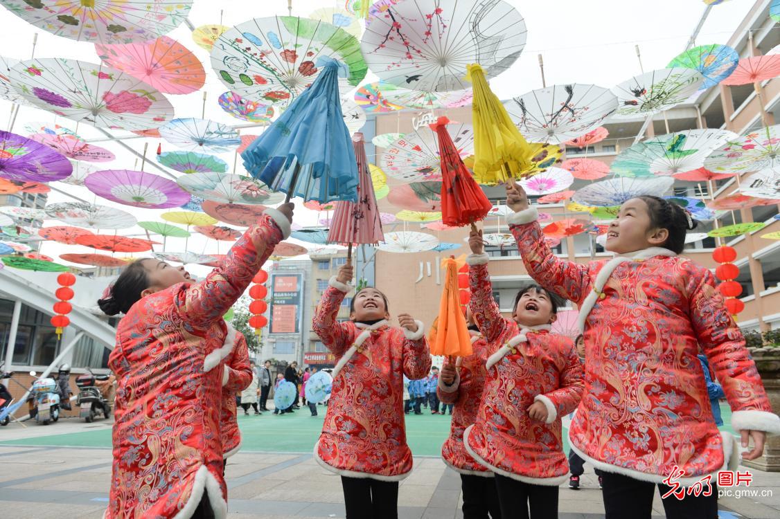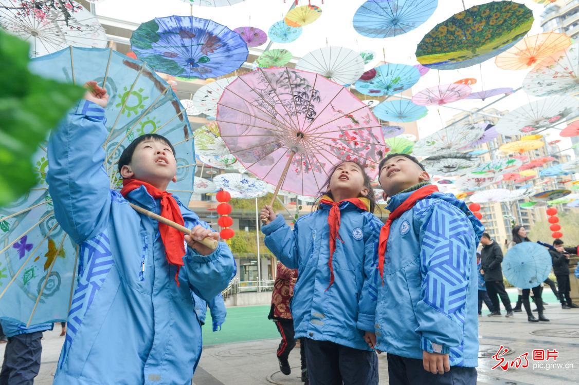 2019年2月19日,浙江省长兴县长兴一小县前街校区开展"纸伞绽放迎开学"活动,一千余把油纸伞装扮校园,迎接开学。据悉,这些油纸扇都是学生们寒假里动手绘制而成,旨在让孩子们感受传统文化的独特魅力。(吴拯摄/光明图片)