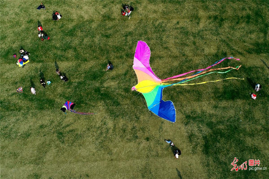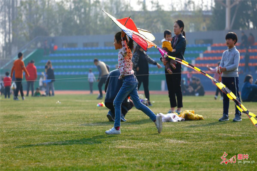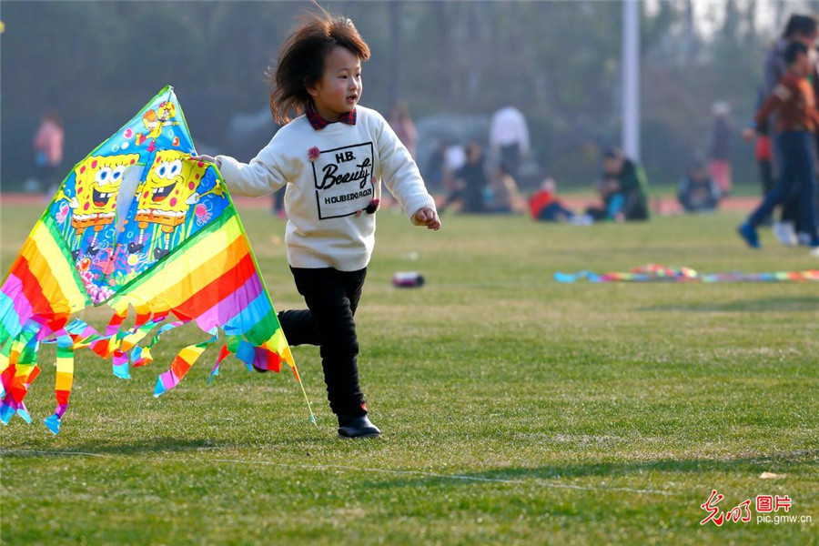 2019年3月10日,安徽庐江县少年儿童在全民健身运动中心放风筝,尽情享受快乐春光。(王闽摄/光明图片)