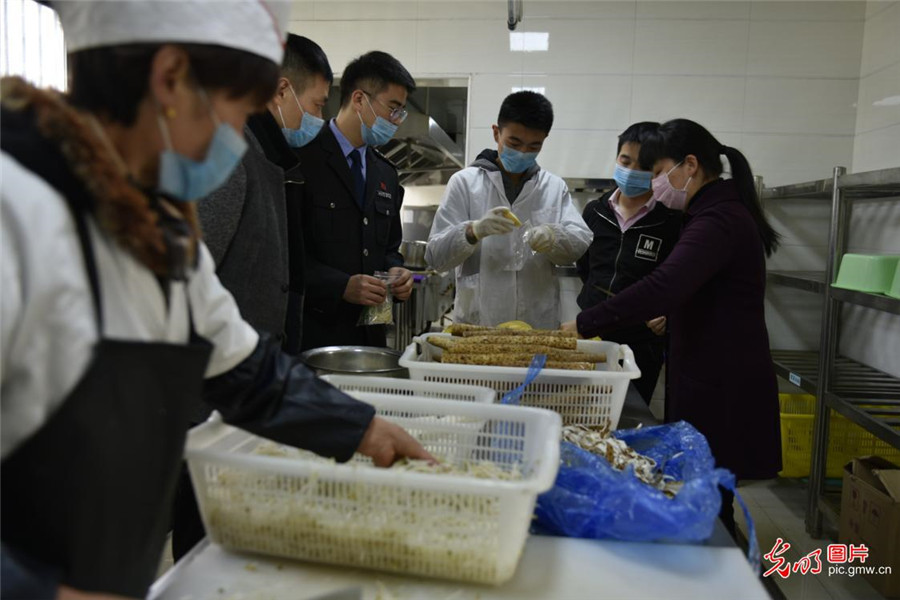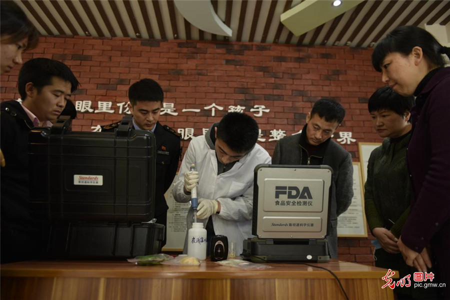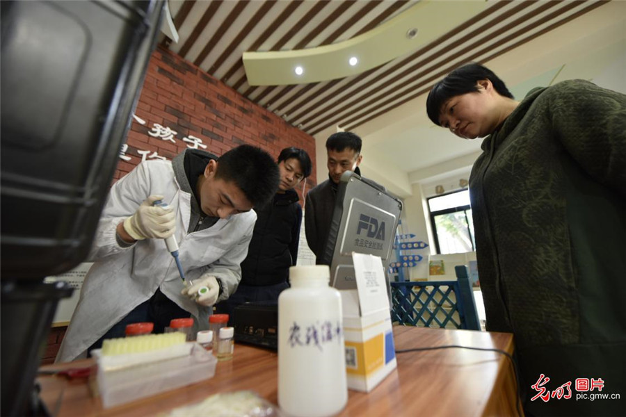 2019年4月1日,安徽省合肥市蜀山区井岗镇食品药品监督所的工作人员对一家幼儿园食堂的蔬菜和肉类进行快速检测。
