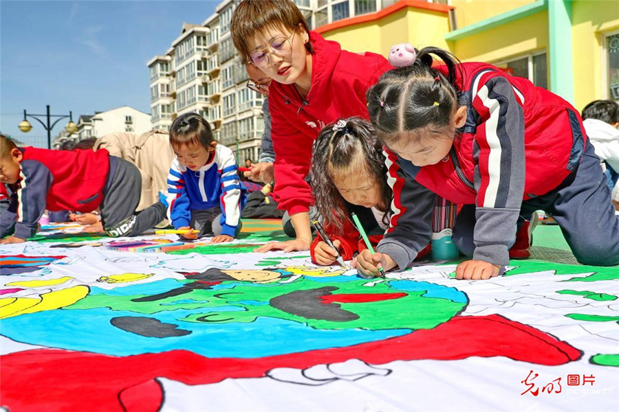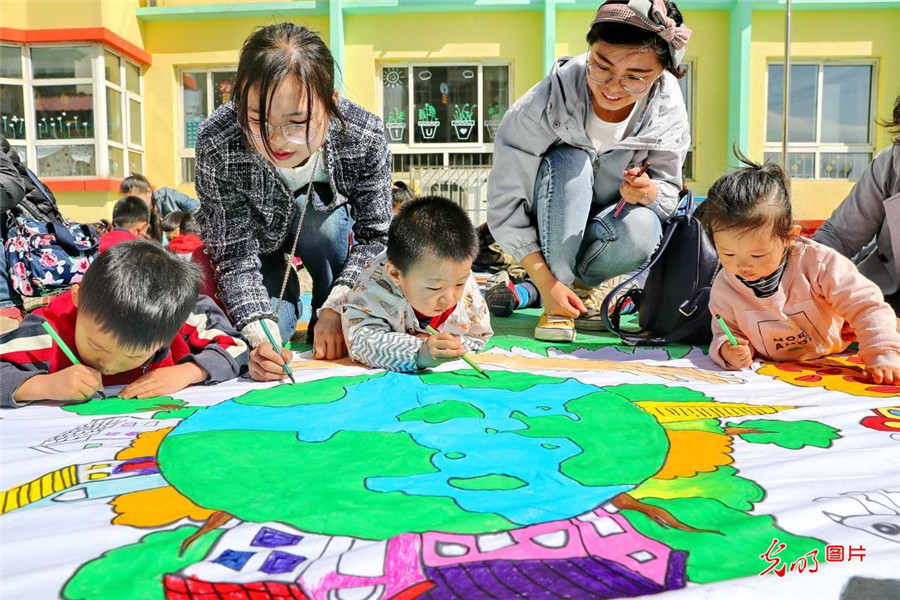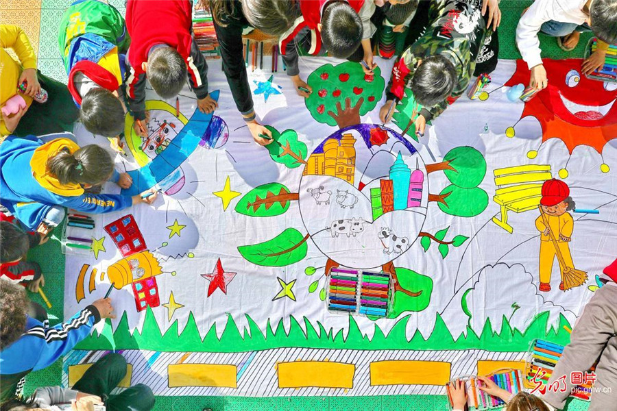2019年4月18日,河北省秦皇岛市海港区社区居民和小朋友共同彩绘长卷。此次活动由社区居民带领辖区幼儿园小朋友用五彩画笔在百米白色画卷上画出自己眼中的美丽地球,增强未成年人保护生态环境和爱护地球的意识。(