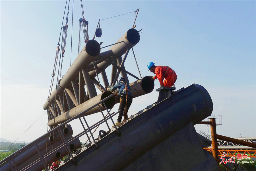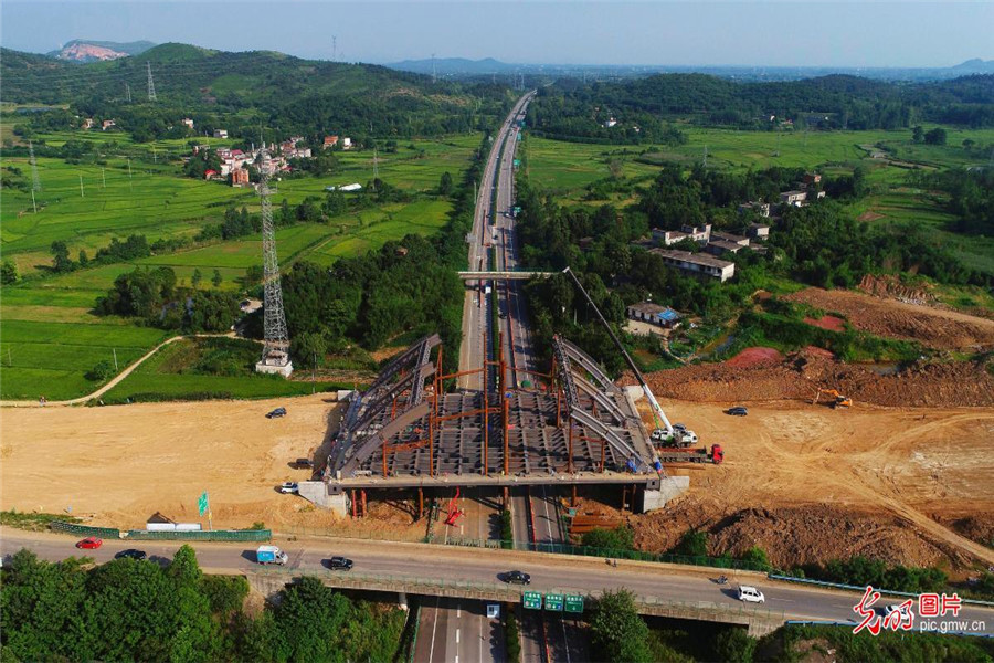 2019年7月2日,施工人员正在安徽省合肥市庐江县境内的巢庐公路(庐城至桐城段)上跨G3京台高速桥进行钢结构安装作业。巢庐公路改建工程,起于G3京台高速庐江南出口与庐江外环南路交叉口,终至庐江县与桐城市交界处,全长20.3公里,是合肥南部副中心一条一级公路。(王闽摄/光明图片)