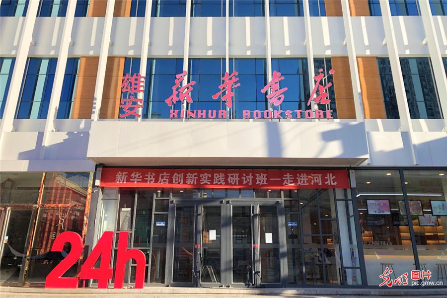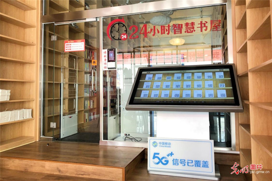 2019年7月2日,河北雄安新区容城县新华书店。近日,由河北移动联合新华书店打造的24小时5G无人智慧书店在雄安新区容城县新华书店成功试点运营,为顾客创造了更便捷、更智慧的购书、阅读体验。(贾昕曈摄/光明图片)