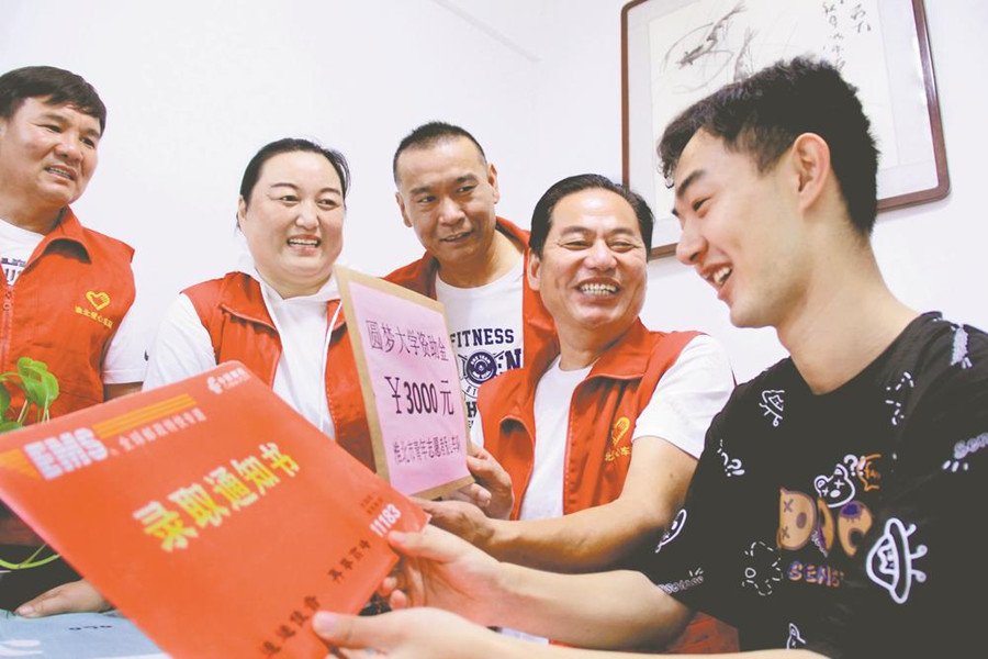 8月15日,淮北市青年志愿者爱心车队开展“爱心汇聚开学季 资助困难学子圆梦大学”活动,为符合资助条件的大学新生送去助学金。今年是他们连续第14年参加“圆梦大学”爱心活动,累计资助131名大学生。 通讯员 周方玲 摄