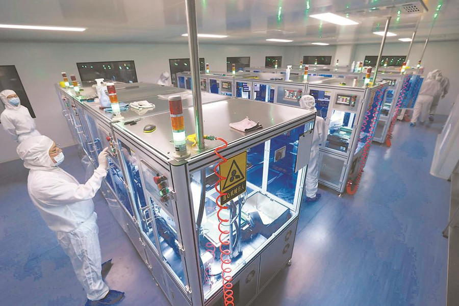 4月9日,必欧瀚生物技术(合肥)有限公司工人在生产抗原检测试剂产品。合肥市多措并举,保障口罩、防护服、抗原检测试剂盒、新冠病毒疫苗等企业开足马力生产,助力疫情防控。