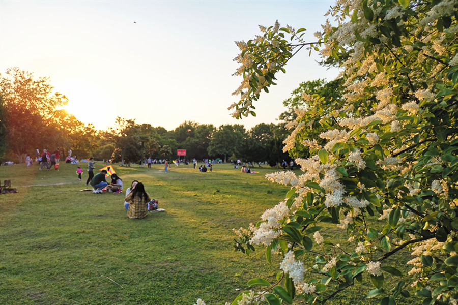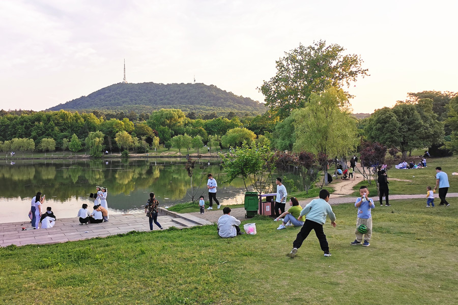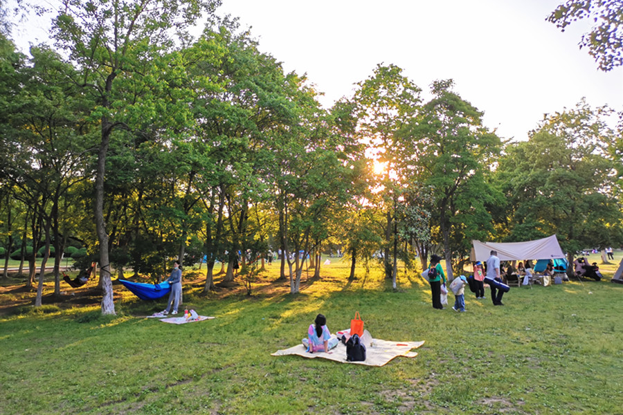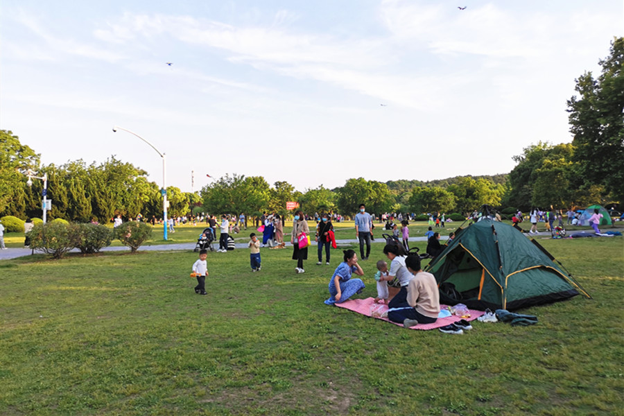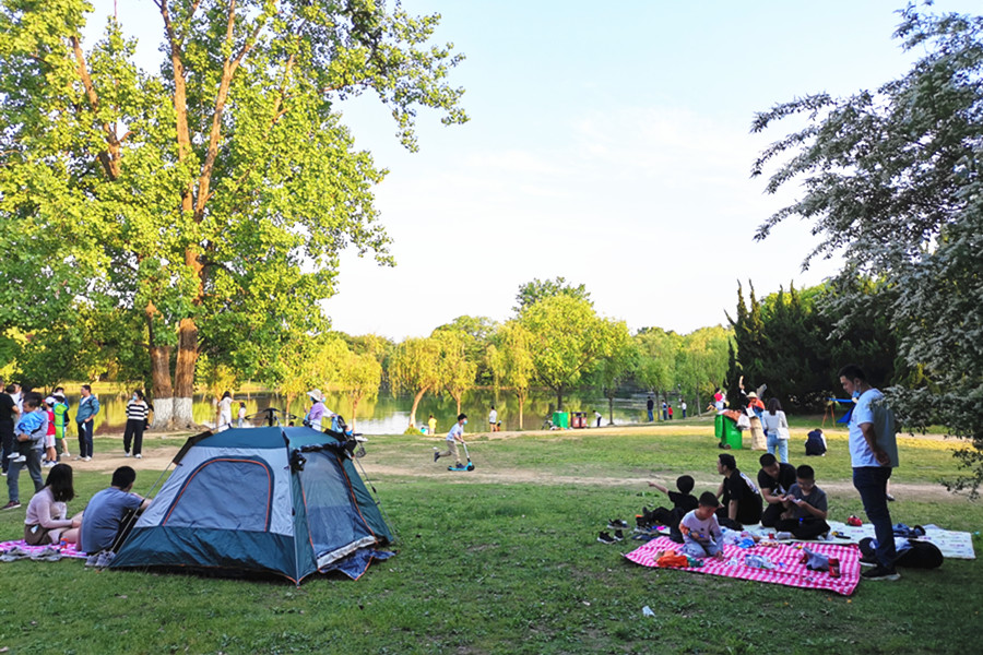 5月3日,合肥市大蜀山森林公园热闹不已,放风筝、骑单车、垂钓、赏花、野餐……人们以多种形式亲近大自然。露营成为热门的度假方式,人们在绿意盎然的草坪上扎起一顶顶帐篷,和亲朋好友一起感受舒适惬意的“慢生活”。