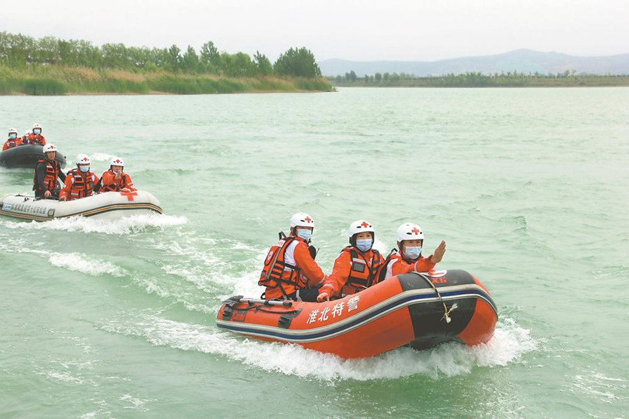 5月8日,在淮北市南湖湿地公园,该市红十字应急救援队在进行应急救援实战演练。当日,淮北市开展汛期应急演练,增强城市救援队伍应急处置和水上抢险救灾能力。