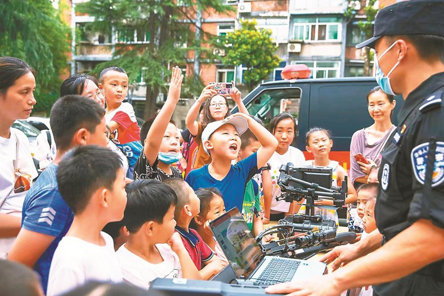 6月28日,合肥市公安局特警支队黑豹突击队队员现场播放未成年人保护宣传片,用提问的方式向小学生宣讲未成年人保护法中关于“家庭保护”“防拐防骗”等相关内容,教导小学生在遇到危险情况时及时向警察叔叔求助。合肥市庐阳区逍遥津街道四牌楼社区党委联合市公安局黑豹突击队等单位,在辖区开展“保护未成年人权利,助力青少年健康成长”主题宣传活动。
