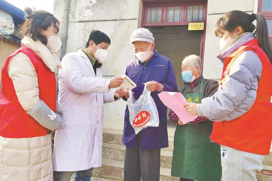 1月8日,志愿者和医护人员到桐城市太平社区七胡庄组82岁的王如范和81岁的胡菊华家中,为老人免费发放“防疫健康包”。连日来,太平社区志愿者和医护人员走村串户到辖区内高龄、独居困难老人家中免费发放“防疫健康包”,面对面宣传预防病毒感染和科学用药知识。目前,该社区共发放“健康爱心包”200多份、小份退热药150多份。