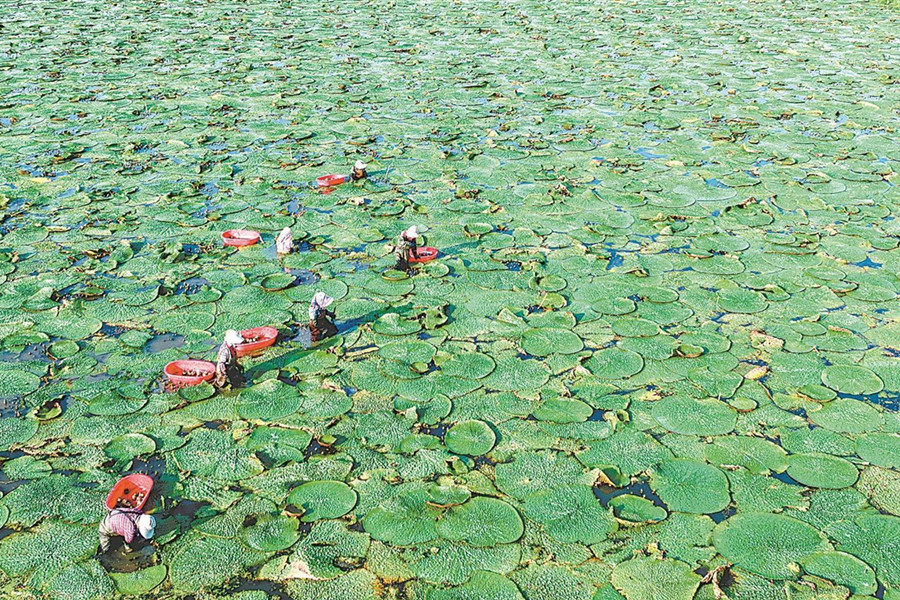 9月8日,在来安县三城镇三城村玉茂家庭农场,连片的芡实叶铺满水面,工人们抓紧采摘成熟的芡实。近年来,来安县致力发展高产高效农业,因地制宜开展特色农产品种植,促进农业增效、农民增收。