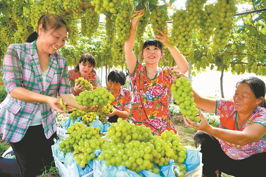 9月10日,在亳州市谯城区赵桥乡双楼村“徽姑娘”家庭农场,果农在采收葡萄以供应市场。近年来,亳州市大力发展生态休闲农业,帮助农民在家门口实现就业增收。