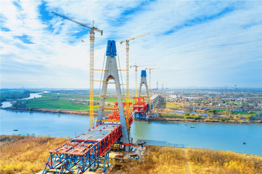 日前航拍的位于当涂县的巢马城际铁路马鞍山公铁两用长江大桥建设现场。该大桥是巢马城际铁路的控制性工程,建成通车后,可进一步拉近合肥都市圈与南京都市圈之间的时空距离。