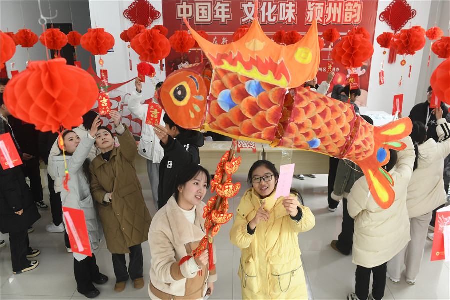 2月24日,阜阳市颍州区新时代文明实践中心大厅,市民在猜灯谜、庆元宵。通讯员 王 彪 摄