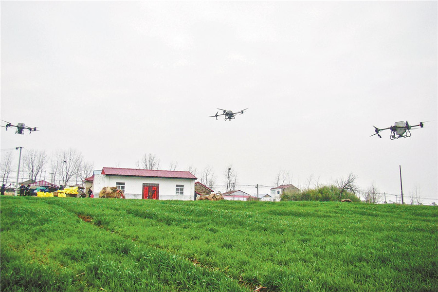 2月26日,淮南市寿县双庙集镇周岗村方郢组1300亩小麦种植地里,卓越粮食种植专业合作社组织植保无人机,对小麦开展春管。通讯员 万前进 摄