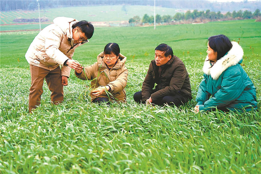 2月26日,怀宁县月山镇奇隆村,农技专家深入麦田指导农户春耕春管,为农业稳产保供打下坚实基础。通讯员 檀志扬 摄