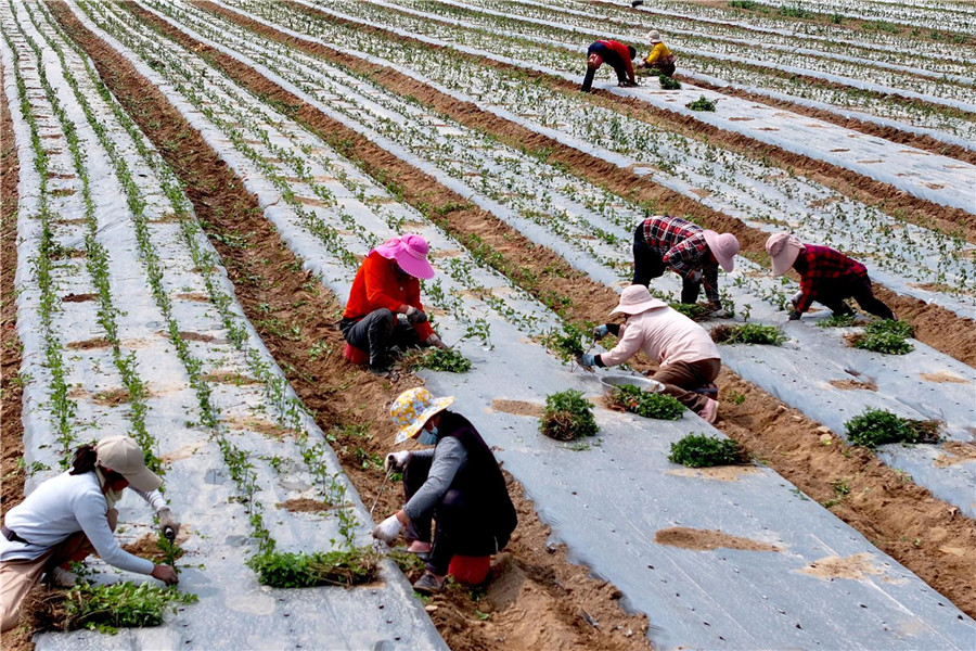5月5日,在亳州市谯城区十八里镇蒋李村,农民在田间栽植菊花。当日是立夏节气,当地农民抢抓农时,进行菊花的移栽、浇水等工作。 通讯员 刘勤利 摄