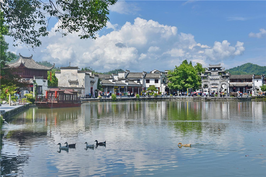 5月23日,黄山市黟县西递景区风景迷人,碧水、树木与徽派古民居相映成趣,吸引众多游人前来游玩。