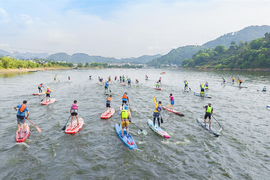 5月26日,2024长三角绿水青山运动会越江向湖·桨板赛在歙县开赛,近700名桨板赛选手和体育运动爱好者,在新安江面上,奋力挥桨,逐浪前行。此次比赛为2024长三角绿水青山运动会的第三站赛事,由沪苏浙皖一市三省体育局与黄山市人民政府主办。