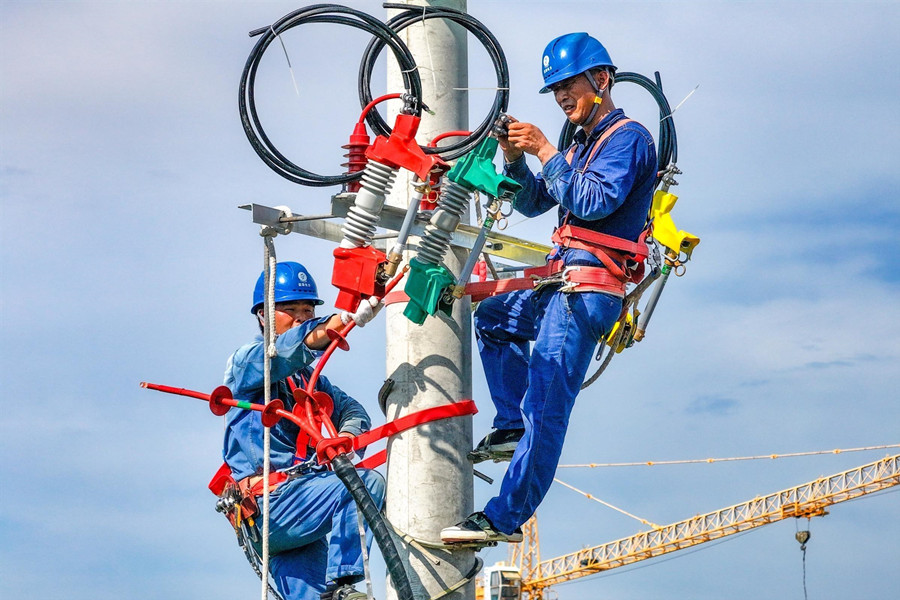 7月22日,在亳州市槐花路施工现场,国网亳州供电公司施工人员在高温下安装10千伏线路跌落保险及附件,全力保障供电安全。