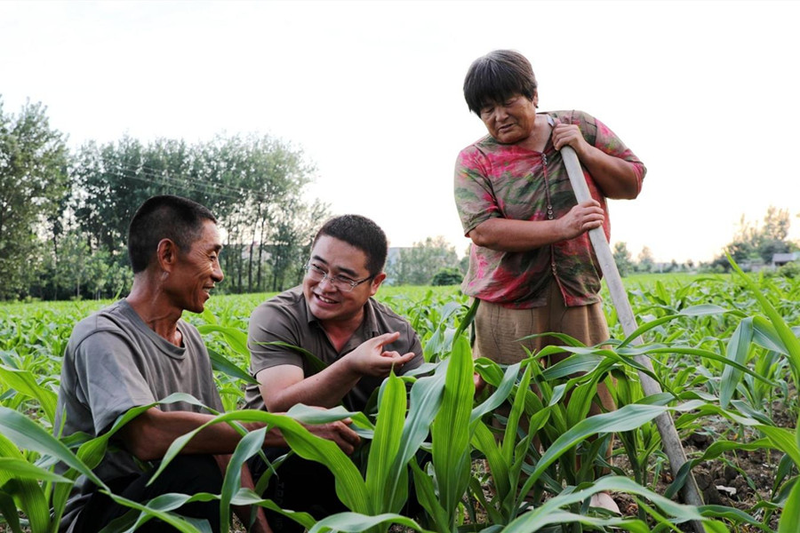 日前,科技特派员(中)在阜阳市颍东区向阳村为农民进行玉米田管技术指导。连日来,颍东区组织100多名科技特派员深入田间地头,面对面向农民传授在地作物病虫害防治等田管知识。通讯员 宿 飞 张 煜 摄