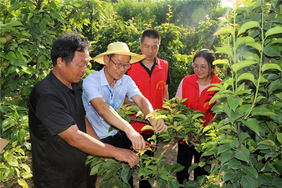 近日,亳州市谯城区牛集镇宋老家果园种植基地,在科技特派员(左二)指导下,果农抓紧时间对梨园开展除草、疏枝等农事活动,不断提升梨树管护质效。 通讯员 武清海 摄