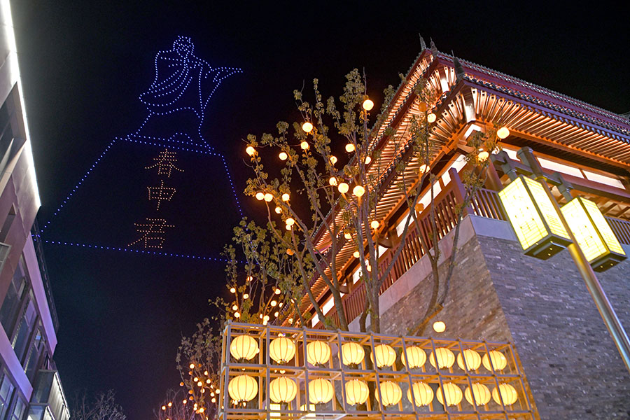 2024年12月29日,安徽省淮南市春申里文旅街区夜空中进行无人机表演,展示楚风汉韵。