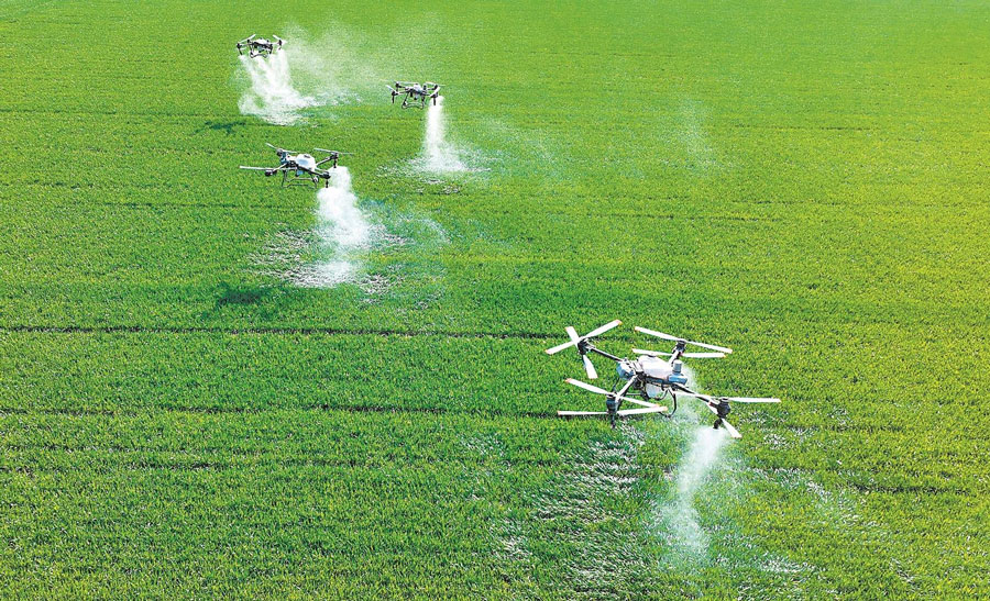 3月19日,在亳州市利辛县胡集镇张庄村麦田,工作人员操作无人机给小麦喷洒药物(无人机照片)。目前,亳州各地正加强小麦田间管理,为丰收打基础。通讯员 刘勤利 刘倩楠 摄