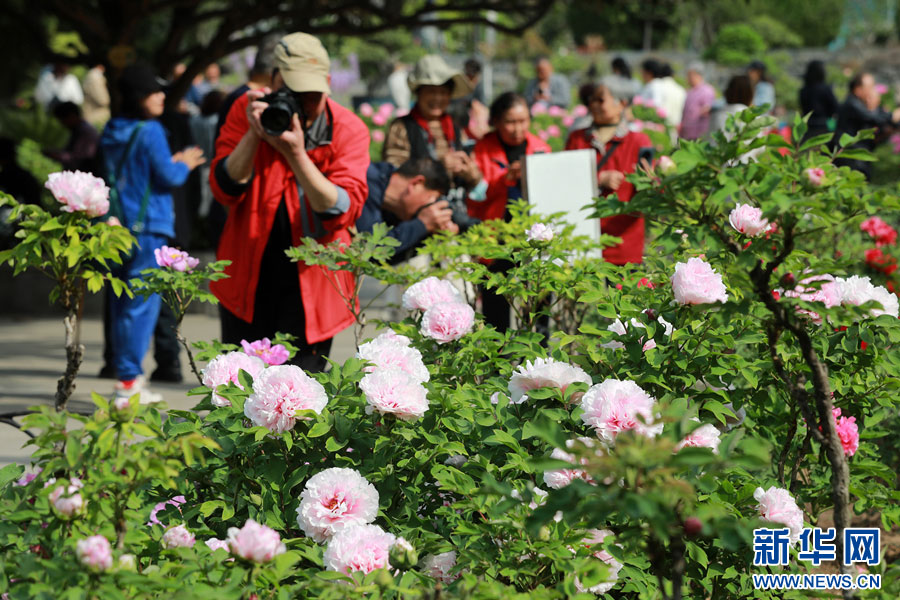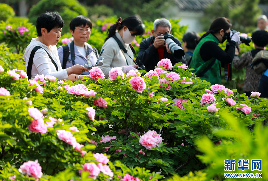 4月8日,游客在安徽省淮北市相山公园牡丹园游览拍照。 新华网发(万善朝 摄)