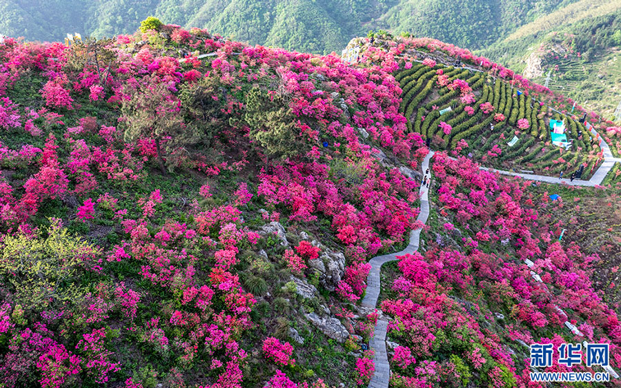 安徽省无为市昆山镇三公山茶叶种植基地,高山杜鹃在翠绿的茶园间绽放,美不胜收(4月10日摄)。