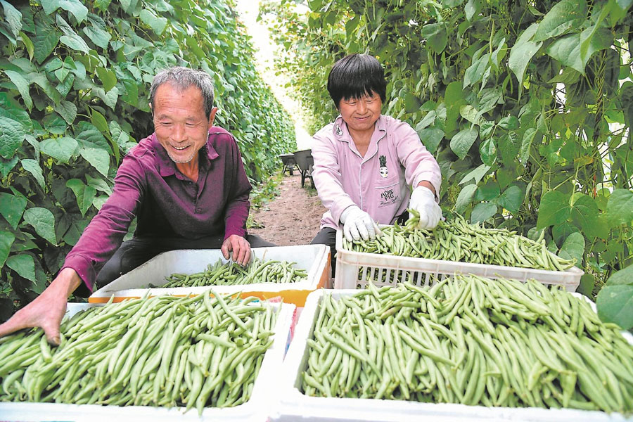 5月6日,亳州市谯城区五马镇常庄村蔬菜种植基地,农民在采摘四季豆供应市场。近年来,谯城区积极引导各村因地制宜发展种植业,拓宽农民增收渠道。通讯员 张刘艳 摄