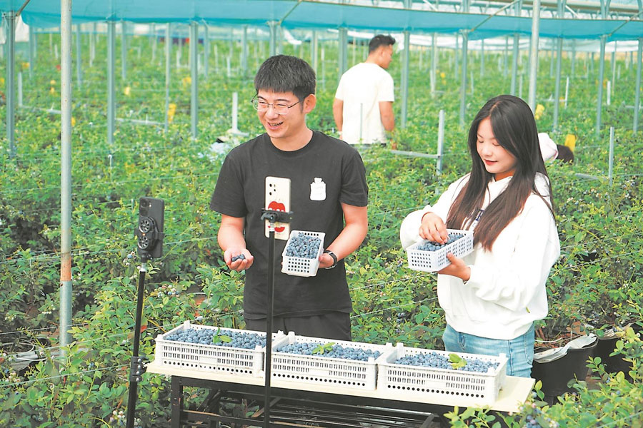 5月7日,在安庆市怀宁县金拱镇高湖村蓝莓种植基地,镇村干部正在地头为果农直播带货,通过现场采摘、品尝,助力农产品销售。通讯员 檀志扬 丁浩浩 摄
