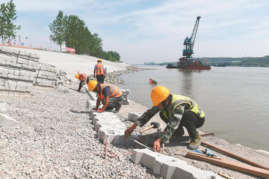 5月13日,施工人员在长江铜陵河段综合治理工程老洲乡堤岸边砌筑护坡,确保已开工长江堤岸在今年长江汛期到来之前完工,发挥效益。