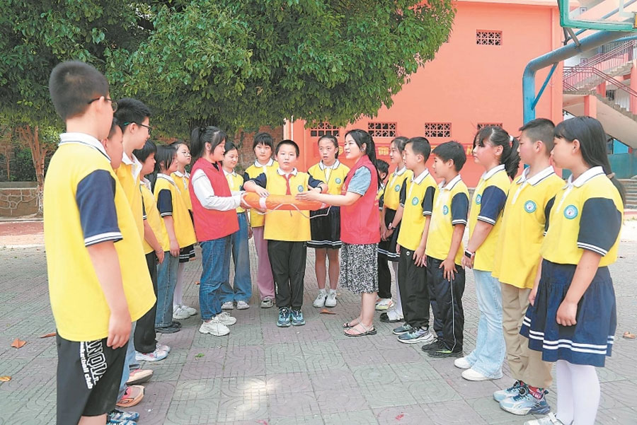 5月14日,枞阳县枞阳小学,志愿者在讲解和演示专业救生圈的使用方法。连日来,枞阳县各中小学校组织开展“防溺水 护安全”活动,提升学生防溺水安全意识。