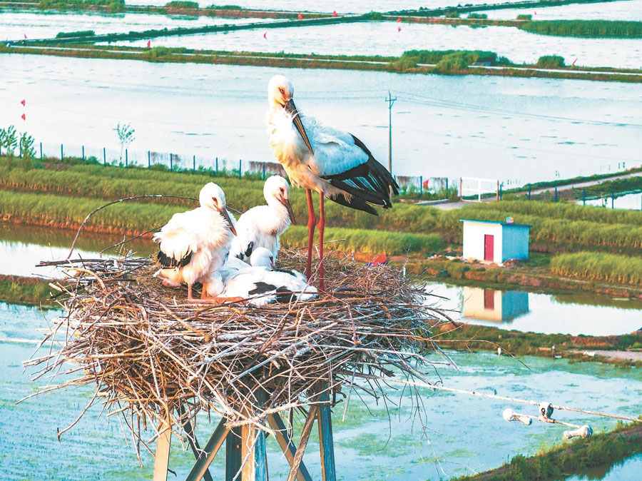 东方白鹳是国家一级保护动物,也是世界濒危物种。今年2月,一对东方白鹳在输电铁塔上的鸟巢里产卵,当地供电部门与保护区迅速行动,安装监控设备、安排专人巡护,并联合养殖户投放鱼虾,保障其食物供应,共同维护美好生态。