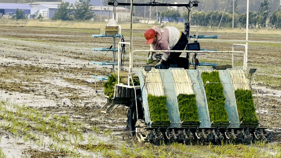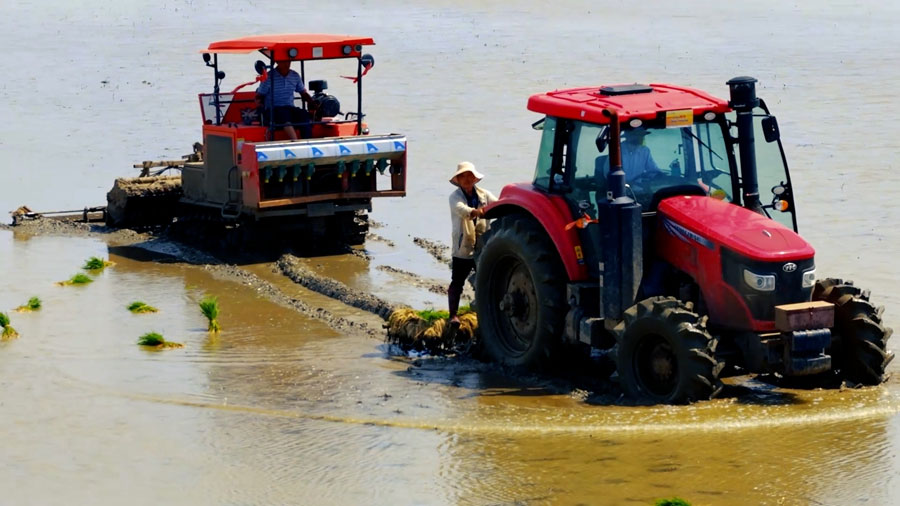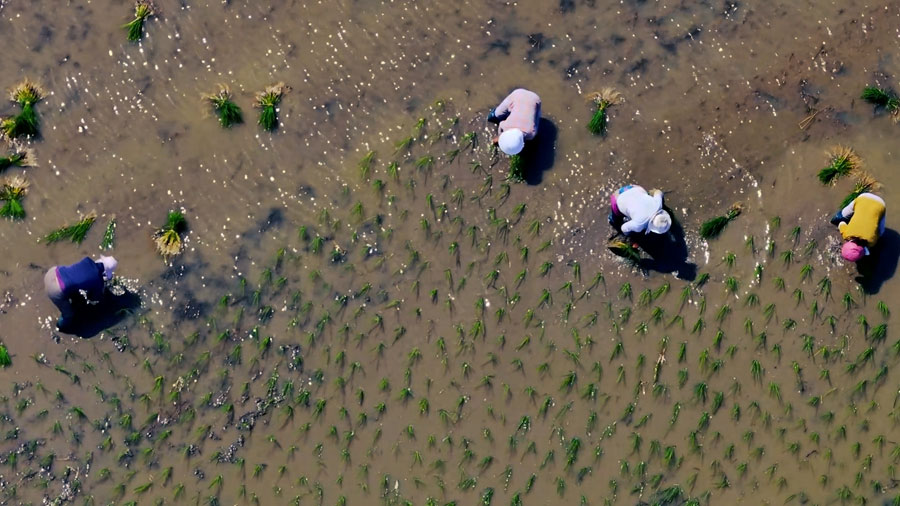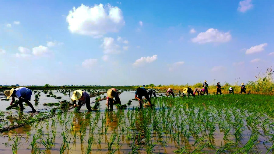 盛夏,在安徽省颍上县王岗镇,农人们熟练地拔秧、运秧、插秧。微风拂过,青绿的秧苗轻轻摇曳,泛起层层绿波,勾勒出一幅宁静而美好的田园风光。(徐红梅 房子仪)