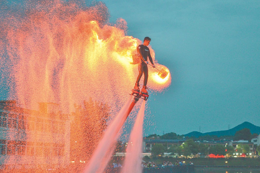 6月20日晚,在铜陵市郊区大通镇,水上火壶、鱼灯巡游、水上龙灯等精彩的非遗表演吸引了众多游客参观体验。通讯员 储著传 摄