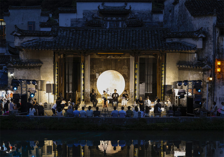 7月8日,在安徽省黄山市黟县宏村,“月沼乐夜”公益音乐会浪漫上演。