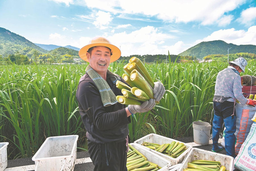 7月13日,在岳西县石关乡马畈村,当地菜农正在采收高山茭白。近年来,茭白成了岳西县农民增收的重要产业。 通讯员 王先国 摄
