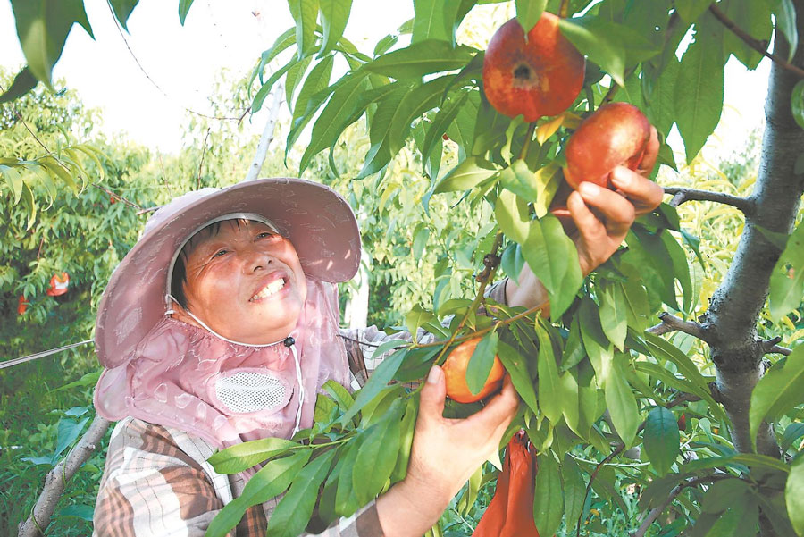 7月4日,淮北市杜集区石台镇刘庄村,果农抢抓晴好天气采摘蟠桃。近年来,当地持续推动蟠桃、黄桃等特色产品种植,带动农民增收。通讯员 刘棋 王倩雯 摄
