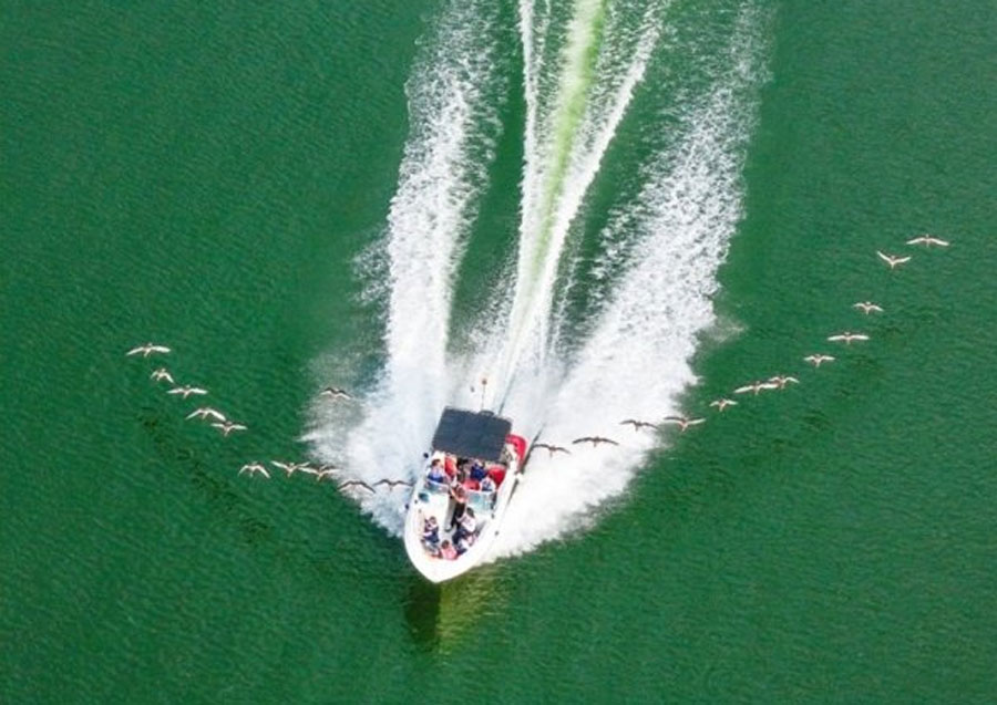 当日,游客搭乘快艇破浪而行,数十只经专业训练的鸿雁展翅凌空、优雅伴飞,与青山碧水相映成趣,共同勾勒出一幅人与自然和谐共生的生态画卷。