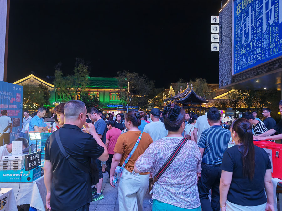 8月23日傍晚,华灯初上,霓虹闪烁,古色古香的塘溪津门水街游人如织。以宋式文化为底蕴的津门水街,不仅汇集各色美食,还有各类国风文创小铺。夜幕降临,美轮美奂的水光交融表演更是吸引大量游客来此打卡消费。“夜经济”不仅点亮了城市的夜色,也在不断激发消费新活力。(贺鹏云)