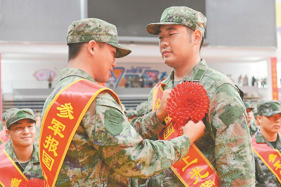 9月16日,在阜阳市2025年下半年新兵入伍欢送暨第25个全民国防教育日主题活动现场,新兵相互整理胸前大红花。据悉,该市1300余名新兵即将离开家乡奔赴军营。特约摄影 王彪 摄