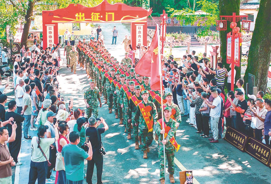 9月15日,在芜湖市繁昌区孙村镇中分村新四军第三支队司令部旧址,当地群众欢送入伍新兵。数十名新战士带着家乡人民的嘱托和期盼,奔赴军营,投身国防建设。通讯员 肖本祥 摄