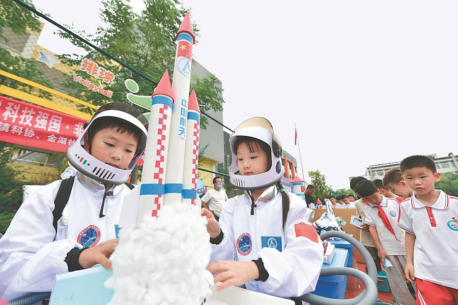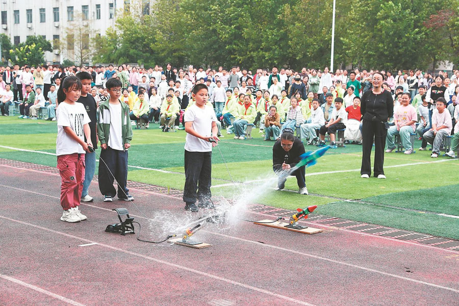 9月17日,蒙城县庄子小学操场,小学生在发射自己制作的“火箭”模型。当天,该校举办科技文化节,小学生竞相展示他们制作的各类科普成果及小发明等。本报通讯员 胡卫国 摄