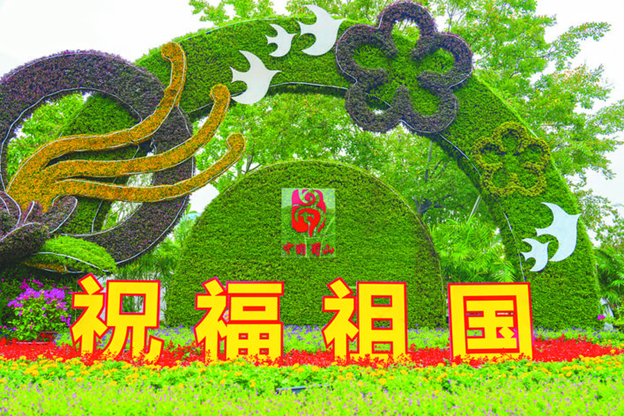 潜山路与休宁路交口的花展将绿色生态理念与科技创新元素相结合,如意造型的绿雕、象征创新的芯片图案,与纷飞的和平鸽、蝴蝶共同勾勒出一幅绿色发展、家国同庆的盛世图景,祈愿人与自然和谐共生。