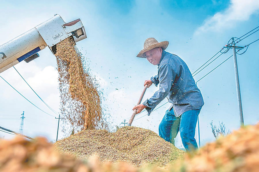 10月8日,芜湖市繁昌区峨山镇城东村,农机手在操作农机收割水稻。 本报通讯员 肖本祥 摄