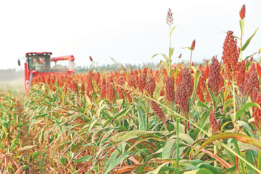 10月8日,安徽农垦集团淮南农场农机手在操作机械抢收高粱。目前,淮南市积极组织机械抢收秋粮,确保秋粮应收尽收。特约摄影 陈彬 摄