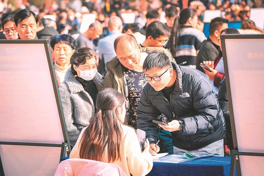 2月22日,当涂县“春风行动·初六大集”专项招聘会现场,求职者了解招聘信息。通讯员 张明伟 摄